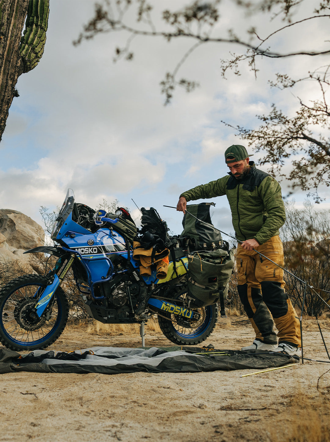 The Jackaloft is super low profile, incredibly warm, and highly packable. Designed for layering under an outer jacket and armor on the bike, but works just as well around camp or in town.