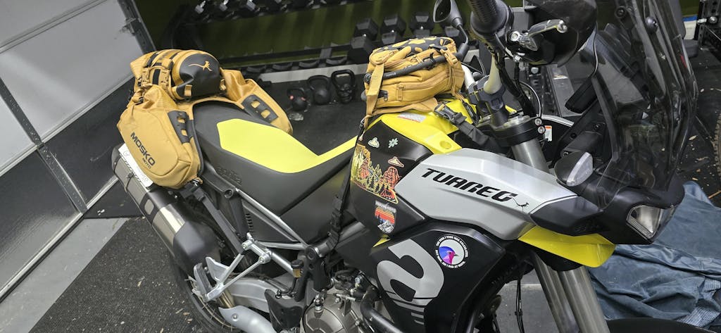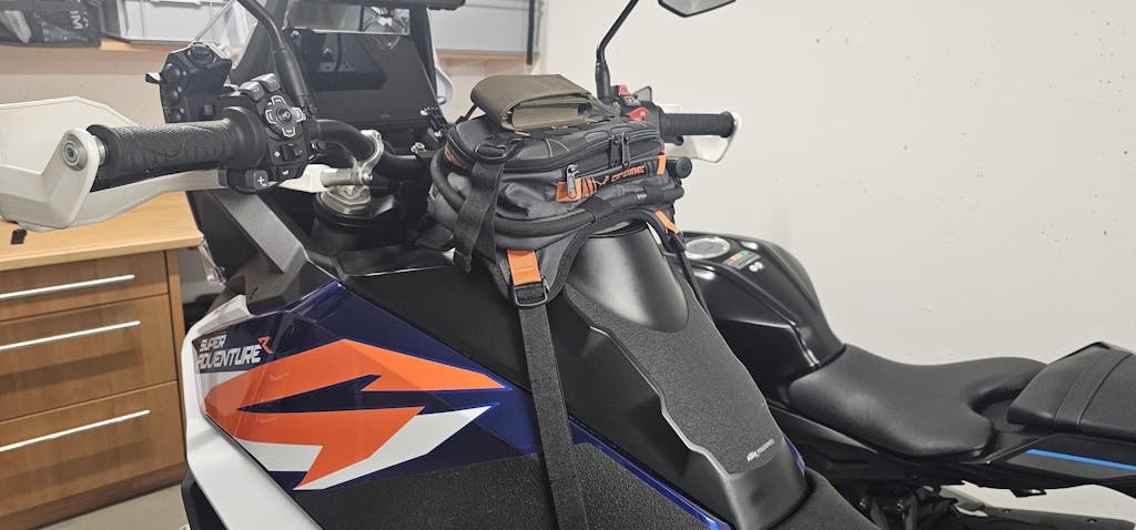 With the Gnome's unique mounting orientation in a landscape position on top of your tank, there is enough space to stand comfortably without restricting movement as you tackle steep mountain passes or miles of Baja whoops. Its 5L storage capacity includes a 1.5L Hydrapak water reservoir within arm’s reach, so you can quench your thirst while riding.