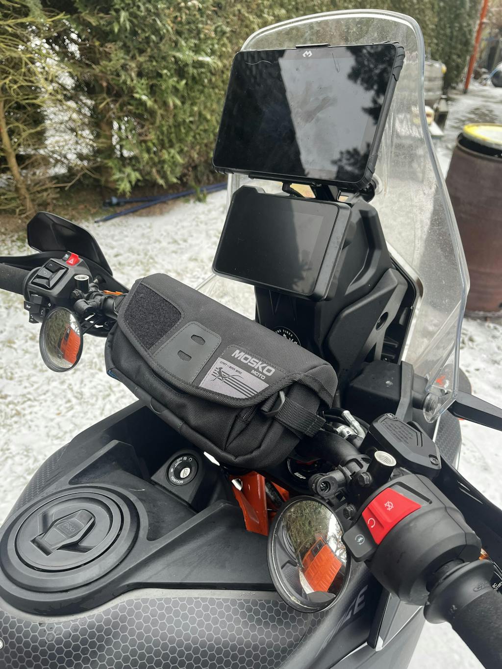 The Gnat Handlebar Bag easily mounts to most motorcycle handlebars using the included Voile straps and is designed to hold small, everyday carry items for fast access like your phone, wallet, sunglasses, ear plugs, charging cables, and trail snacks.