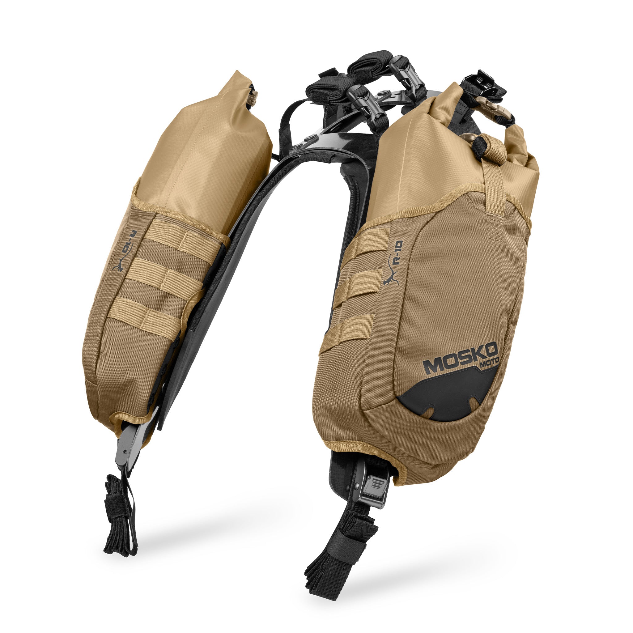 With the R10, you can carry up to 5 extra fuel bottles, four of which can be stored in the harness, and one in an optional MOLLE bottle holder on the non-exhaust side of the bike. The fuel bottles can be connected to each other with a leash that is provided on the bottom of the R10 dry bag. This is a cost-effective way of extending your range without having to purchase a large aftermarket desert tank.